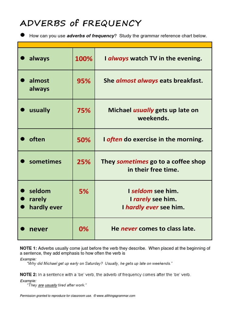 We often place adverbs of frequency in these positions. Jenna always talks too loud. The download at the end will give you additional practice adding these adverbs and adverbs of frequency are usually one word. Learn how to use frequency adverbs in sentences with useful grammar rules and examples. I've found that using percentages when teaching adverbs of frequency really helps students comprehend the differences in meaning. Read this article to know how to use them. Adverbs of indefinite frequency also tell us when the action takes place but does not give an exact time. Occasionally, often, sometimes, usually, always As you watch the video, look at the examples of adverbs of frequency. You have known about adverbs and its different types. Adverbs of frequency always describe how often something occurs each sentence contains an example of an adverb of frequency; We can also use the following expressions when we want to be more specific about the frequency: Students study adverbs of frequency (aka adverbs of time, frequency adverbs) early on because they are used with the simple present tense.